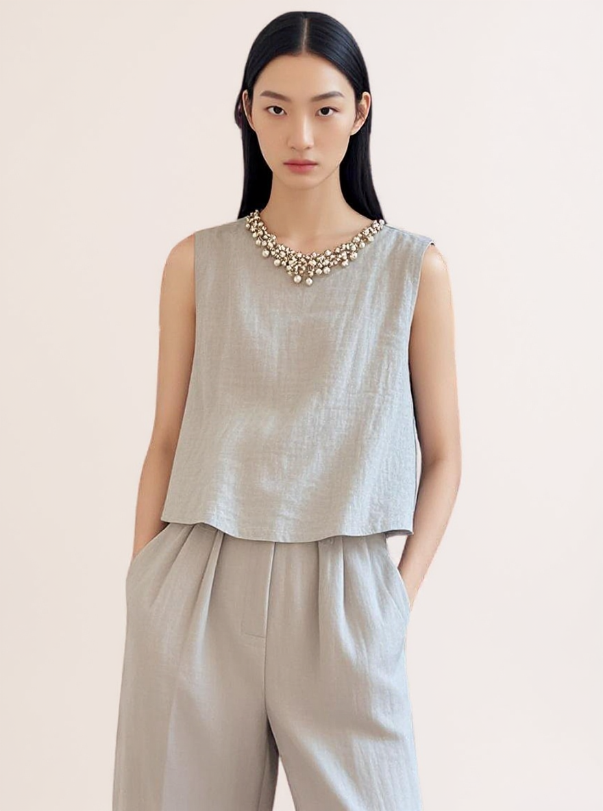 • 風格:簡約無袖上衣,搭配高腰寬褲設計
